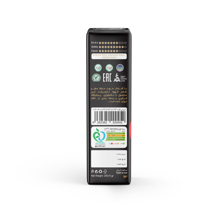 سابه های قهوه با تکنولوژی بسته بندی وکیوم برای اولین بار در ایران توسط دونیسی تولید شده اند. این محصولات را در پوشش 4 لایه آمینیومی و به شکل وکیوم شده بسته بندی کرده ایم تا کیفیت سابه قهوه را که در مجاورت نور و اکسیژن به سرعت دستخوش تغییرات منفی می گردد، به خوبی حفظ کنیم. این روش تنها و تنها روش صحیح بسته بندی و نگه داری از سابه قهوه است! سابه قهوه 250 گرمی دُلچه از مرغوب ترین دانه های آمریکای مرکزی و آفریقای مرکزی و آسیای جنوب شرقی، با ترکیب 70% عربیکا و %30 ربوستا تولید شده است. عطر دُلچه در مشام شما با شدت 9 امتیاز احساس خواهد شد. تناسب و وضوح طعم های آجیلی و شکلاتی آن امتیازی معادل 7 را دریافت می کند. دُلچه اسیدیته ای ملایم و میزان تلخی متوسطی دارد و میتوان از آن برای تهیه فنجان قهوه ای با بافت کرمی که 7 امتیاز را به خود اختصاص میدهد و پس مزه ای نسبتا طولانی استفاده کرد. دُلچه، که ترکیب 30-70 قهوه های دونیسی است، برای دوستداران قهوه هایی با بافت و طعم قوی تر طراحی شده. پس اگر در خانه دستگاه اسپرسو یا موکاپات دارید و قهوه ساییده شده را برای خرید ترجیح میدهید، برای خرید دُلچه و تجربه طعم منحصر به فرد آن زمان را از دست ندهید. پیشنهاد ما با توجه به اندازه سابه دُلچه، این است که از این محصول برای تهیه اسپرسو و موکاپات استفاده کنید. فراموش نکنید که نور و اکسیژن تازگی و عطر و طعم قهوه شما را تحت تاثیر قرار خواهند داد، پس برای نگهداری از سابه قهوه پس از باز کردن بسته بندی وکیوم، محتویات آن را به ظرفی مناسب منتقل کنید.