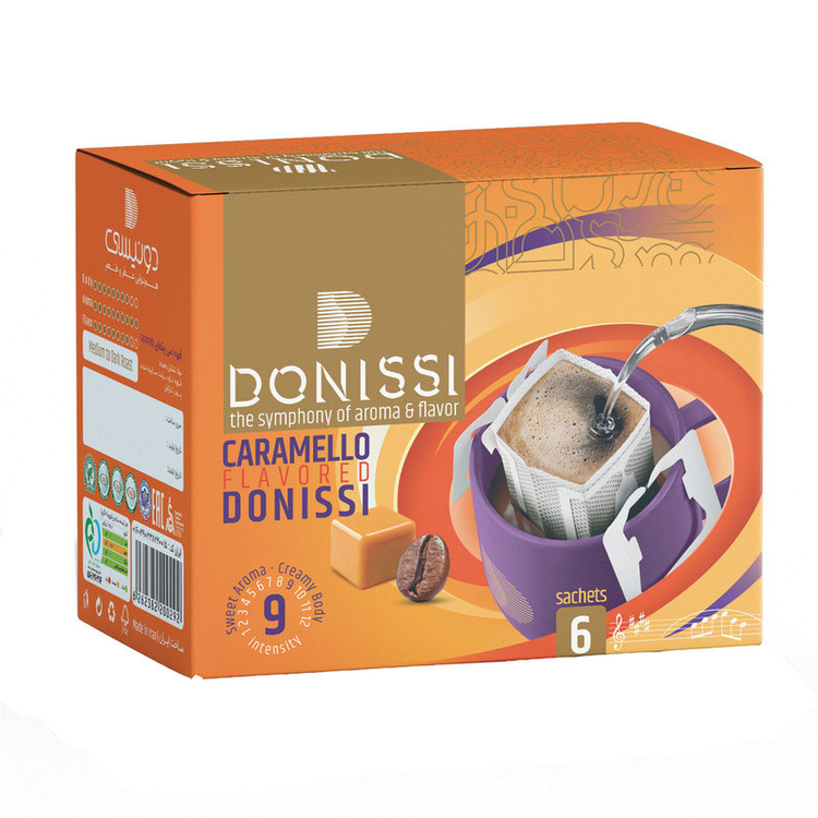 قهوه، اولین انتخاب برای آغاز است! آغاز یک راه جدید ، آغاز یک روز خارق العاده از زندگی! اکسیری خوش عطر و طعم برای آنکه حالمان بهتر باشد و بهترین خودمان باشیم. این دانه اعجاب انگیز در واقع هسته میوه ای شبیه به گیلاس است که درختان آن در محدوده نوار استوا رشد می کنند. این گیاه، بسته به تفاوت در محل رشد و شرایط آب و هوا، خاک و میزان رسیدگی کشاورز، ویژگی های طعمی متفاوتی را از خود بروز میدهد. یکی از دلایلی که بین قهوه نوش ها و فنجان قهوه ای خوش عطر و طعم فاصله می اندازد، نیاز داشتن به تجهیزاتی مانند آسیاب قهوه و ابزار های دم آوریست که تهیه آنها هزینه نسبتا زیادی دارد و گذشته از آن همراه داشتن آن ها در مدرسه، دانشگاه، محل کار یا سفر، کار ساده ای نیست. علاوه بر این پیدا کردن کافه ای که قهوه مورد پسند برایتان آماده کند سخت و زمان بر است! دریپ بگ های دونیسی برای ازمیان برداشتن همه این مشکلات در اختیار شما هستد. در این محصولات سابه قهوه تازه برشت با درجه آسیاب مناسب قهوه های دمی، در کیسه هایی از جنس الیاف مخصوص ریخته شده ست. این کیسه ها به کمک حرارت و بدون دخالت دست دوخته میشوند و در دو طرفشان دست گیره هایی مقوایی برای قرار گرفتن روی لبه لیوان تعبیه شده تا به سادگی روی لیوان شما قرار بگیرند و نقش ابزاری برای دم آوری قهوه را ایفا کنند. دم آوری دریپ بگ، کاری بسیار ساده است و نیاز به هیچ گونه تجهیزاتی نداشته و در کمتر از 2 دقیقه آماده میشوند. برای دم آوری آن ها باید ابتدا فیلتر را از ساشه خارج کرده، از محل خط چین باز نمایید و گیره های آن را روی لبه لیوان قرار دهید. سپس آب داغ حدود ۹۰ درجه سانتیگراد (کمی پایین تر از نقطه جوش) را به حالت دورانی روی پودر قهوه داخل آن بریزید. این عمل را بنا به سلیقه خود ۲ تا ۳ بار تکرار نمایید. پیشنهاد می شود بار اول، آب را تا نیمه کیسه اضافه کرده و در دفعات بعدی آن را کامل پر کنید. در راستای رسیدن به طعم دلپذیر قهوه بهتر است از آب معدنی یا آب تصفیه شده استفاده نمایید. به همین سادگی! تمام چیزی که برای داشتن یک لیوان قهوه خوش عطر و طعم نیاز دارید را برایتان درون یک ساشه آلمینیومی که با تکنولوژی روز دنیا (MAP) تولید شده است و کیفیت عطر و طعم قهوه تازه برشت را تضمین میکند، تدارک دیده ایم. دریپ بگ کاراملو با بسته بندی در جعبه هایی با 6 ساشه 10 گرمی، در حدود 37 کیلوکالری دارد. این کالری از 0.8 گرم چربی طبیعی قهوه تولید میشود و مقدار قند، نمک و اسید های چرب ترانس آن 0 است. این محصولات در هشت نوع متفاوت برای پوشش دادن گستره سلیقه مخاطبان قهوه تولید شده اند. سامبا و ساهارا، محصولات تک خاستگاه دریپ بگ های دونیسی هستند. این محصولات با عطر و طعم هایی منحصر به خاستگاهشان برای دوست داران قهوه هایی با اسیدیته و طعم یاد های میوه ای طراحی شده اند. خانواده بعدی دریپ بگ های دونیسی، قهوه هایی اند که برای نوشیدن در وعده های مختلف روز طراحی شده اند. صرف قهوه در وعده صبح برای برخی باعث به هم ریختن سیستم گوارش و دل درد میشود. دریپ بگ صبح بخیر دونیسی میزان کافئین بالایی داشته و با توجه به شدت اسیدیته بسیار کم و بافت قوی، نوشیدنی مناسبی برای شروع روز، حتی در کنار صبحانه است. دریپ بگ ظهر بخیر دونیسی، طعم و کافئین متعادلی دارد و عطر و طعمش در میانه روز، در محل کار یا دانشگاه انرژی شما را برای ادامه روز کاری تامین میکند. دریپ بگ عصر بخیر دونیسی نیز با مقدار کافئین نسبتا کم و عطر و طعمی ملایم، برای این طراحی شده تا انرژی شما را برای پایان روز کاری و گذراندن ساعات استراحت عصرانه تنظیم کند. دریپ بگ دیکف دونیسی، از قهوه های کافئین زدائی شده کمپانی سوئیس واتر که بهترین کمپانی در زمینه کافئین زدایی از قهوه است، تولید شده است. دیکف میتواند انتخاب خوبی برای ساعاتی باشد که تمایلی به دریافت کافئین ندارید، باشد. علاوه بر این کسانی که به هر دلیلی از مصرف کافئین منع شده انذ نیز میتوانند با استفاده از این محصول از عطر و طعم قهوه لذت ببرند. دری