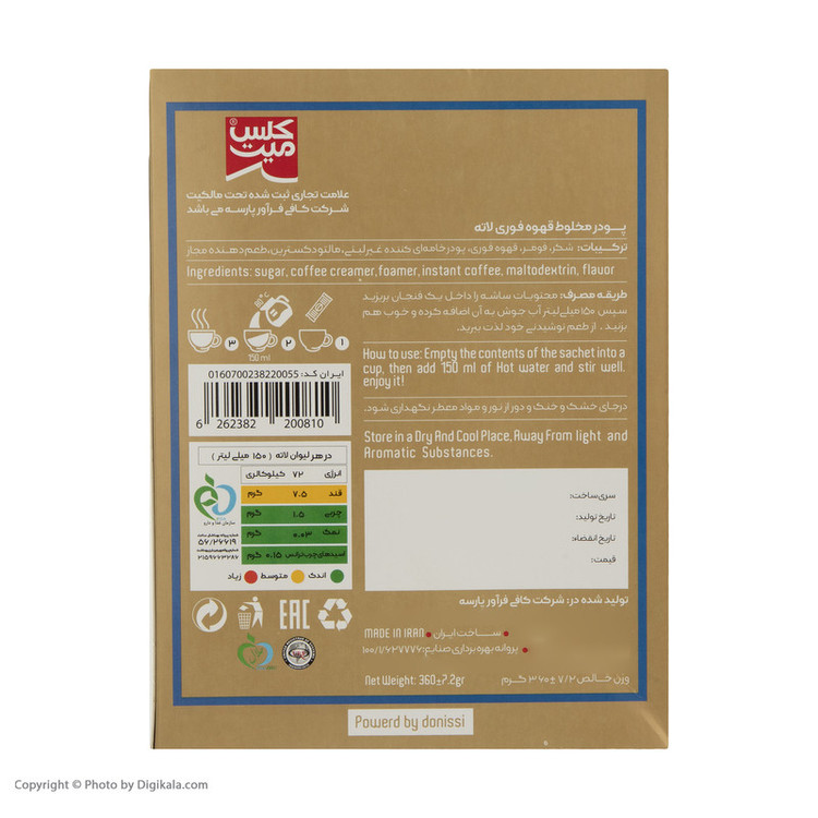 پودر مخلوط قهوه فوری لاته کلس میت - 20 ساشه 18 گرمی