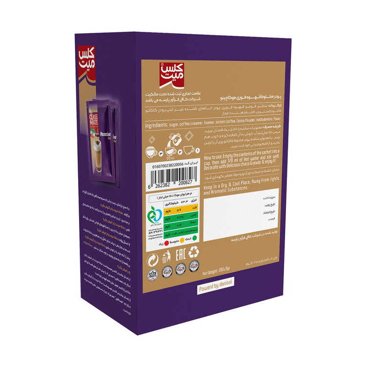 موکاچینو کلس میت، با اضافه کردن کاکائو به ترکیب محبوب شیر و قهوه عطر و طعمی وسوسه انگیز را برایتان تدارک دیده است چرا که خلاقیت و بررسی تمام نیازهای مصرف کنندگان قبل از تولید یکی از مهم ترین رویکردهای همکلاسی است! کلس میت برای اولین بار در ایران ترکیبی از شکلات و شیر و قهوه را در غالب پودر فوری نوشیدنی گرم طراحی و تولید کرده است تا تجربه چشیدن نوشیدنی گرم جدیدی را برایتان مهیا کند.