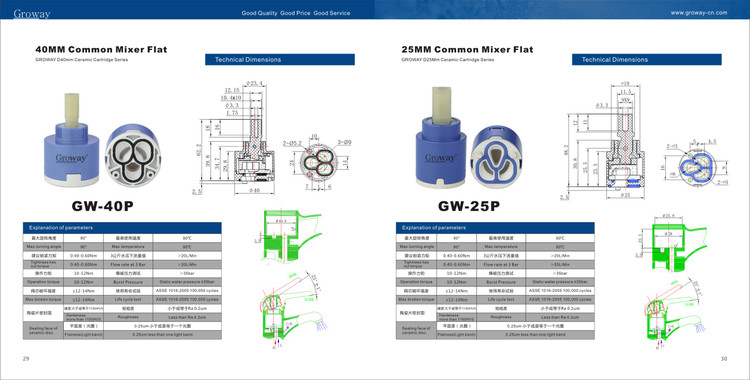 کاتریچ ۴۰ فشار قابل تحمل ۴۵ بار فشار عملیاتی حداکثر ۱۲ بار دمای قابل تحمل ۳ الی ۹۰ درجه سانتیگراد زاویه چرخش افقی دسته ۱۰۰ درجه زاویه چرخش عمودی دسته ۲۵ درجه