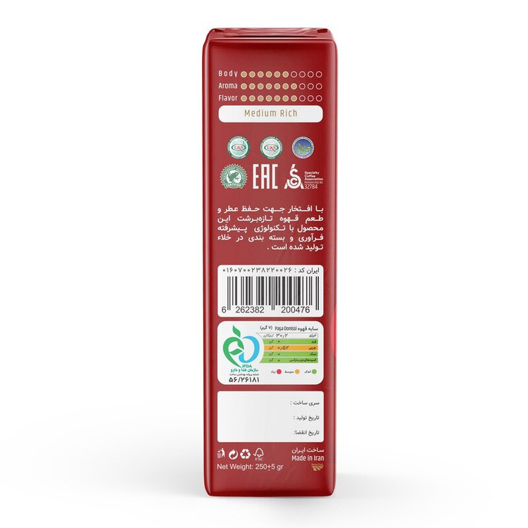 سابه های قهوه با تکنولوژی بسته بندی وکیوم برای اولین بار در ایران توسط دونیسی تولید شده اند. این محصولات را در پوشش 4 لایه آمینیومی و به شکل وکیوم شده بسته بندی کرده ایم تا کیفیت سابه قهوه را که در مجاورت نور و اکسیژن به سرعت دستخوش تغییرات منفی می گردد، به خوبی حفظ کنیم. این روش تنها و تنها روش صحیح بسته بندی و نگه داری از سابه قهوه است! سابه قهوه ترک 250 گرمی پاشا از مرغوب ترین دانه های آمریکای جنوبی، با درجه ای متناسب با ذائقه ایرانی برشته کاری کرده ایم. عطر پاشا در مشام شما با شدت 7 امتیاز احساس خواهد شد. تناسب و وضوح طعم های برشته و کاراملی آن امتیازی معادل 7 را دریافت می کند. پاشا اسیدیته ای کم و میزان تلخی متوسطی دارد و میتوان از آن برای تهیه فنجان قهوه ای با بافت مخملی که 6 امتیاز را به خود اختصاص میدهد و پس مزه ای دوستداشتنی و اصیل استفاده کرد.